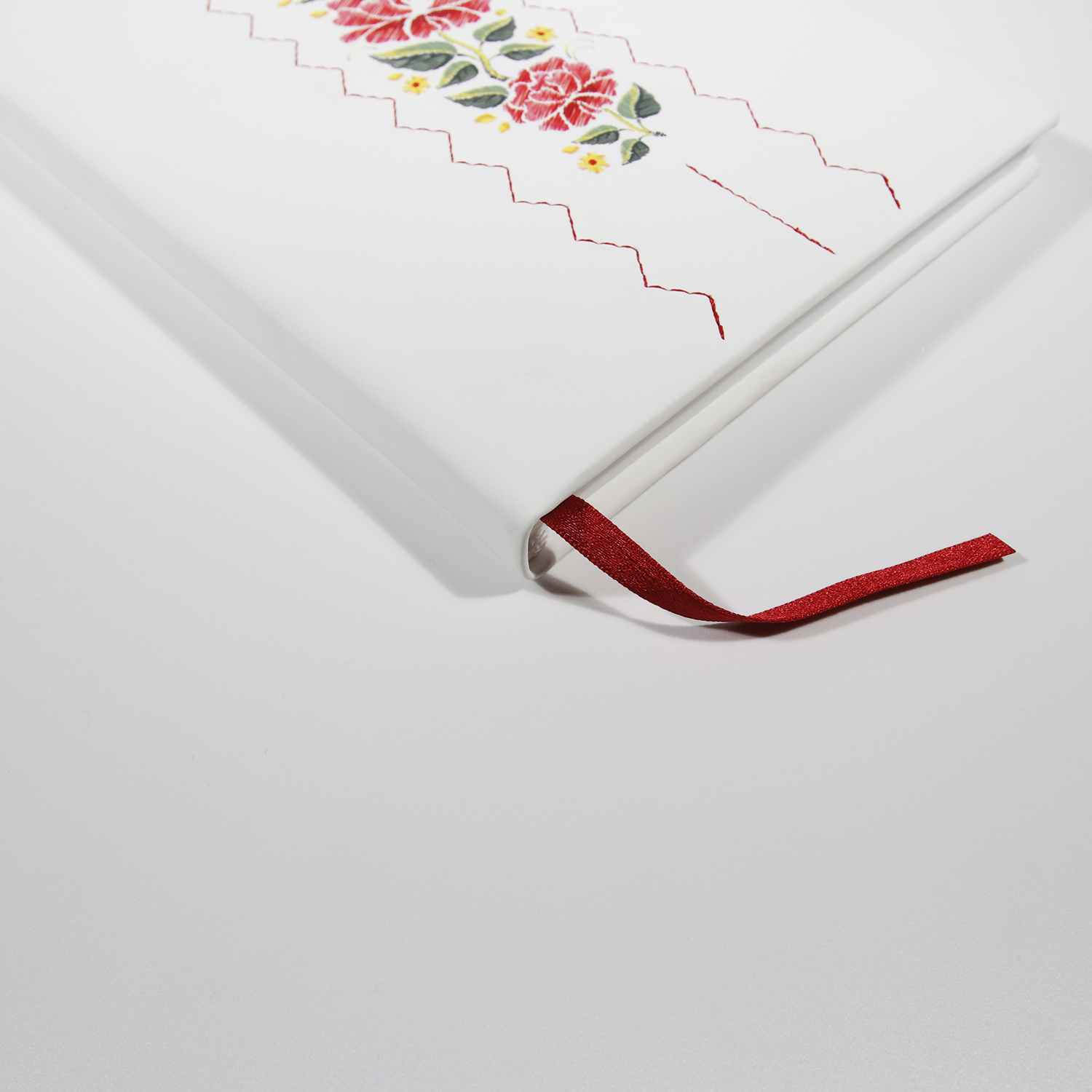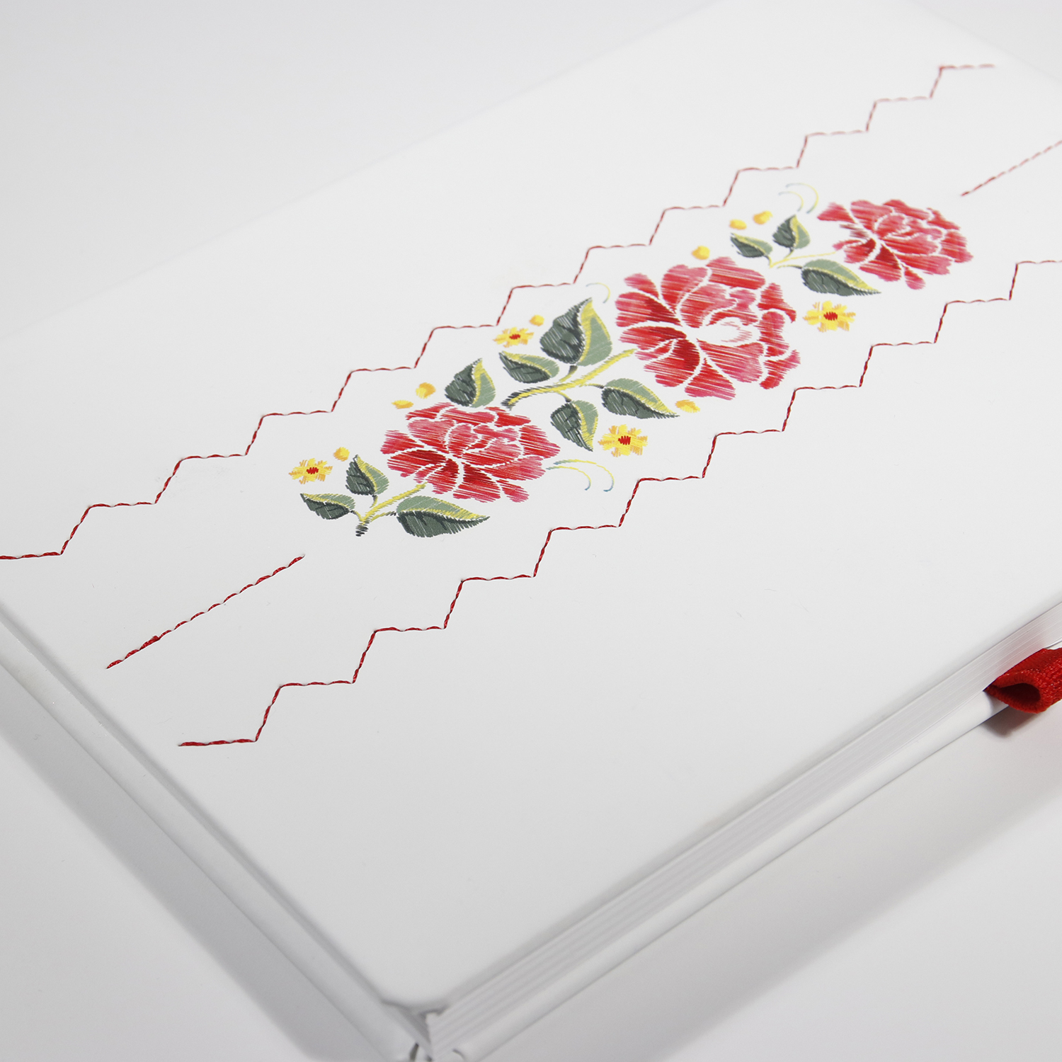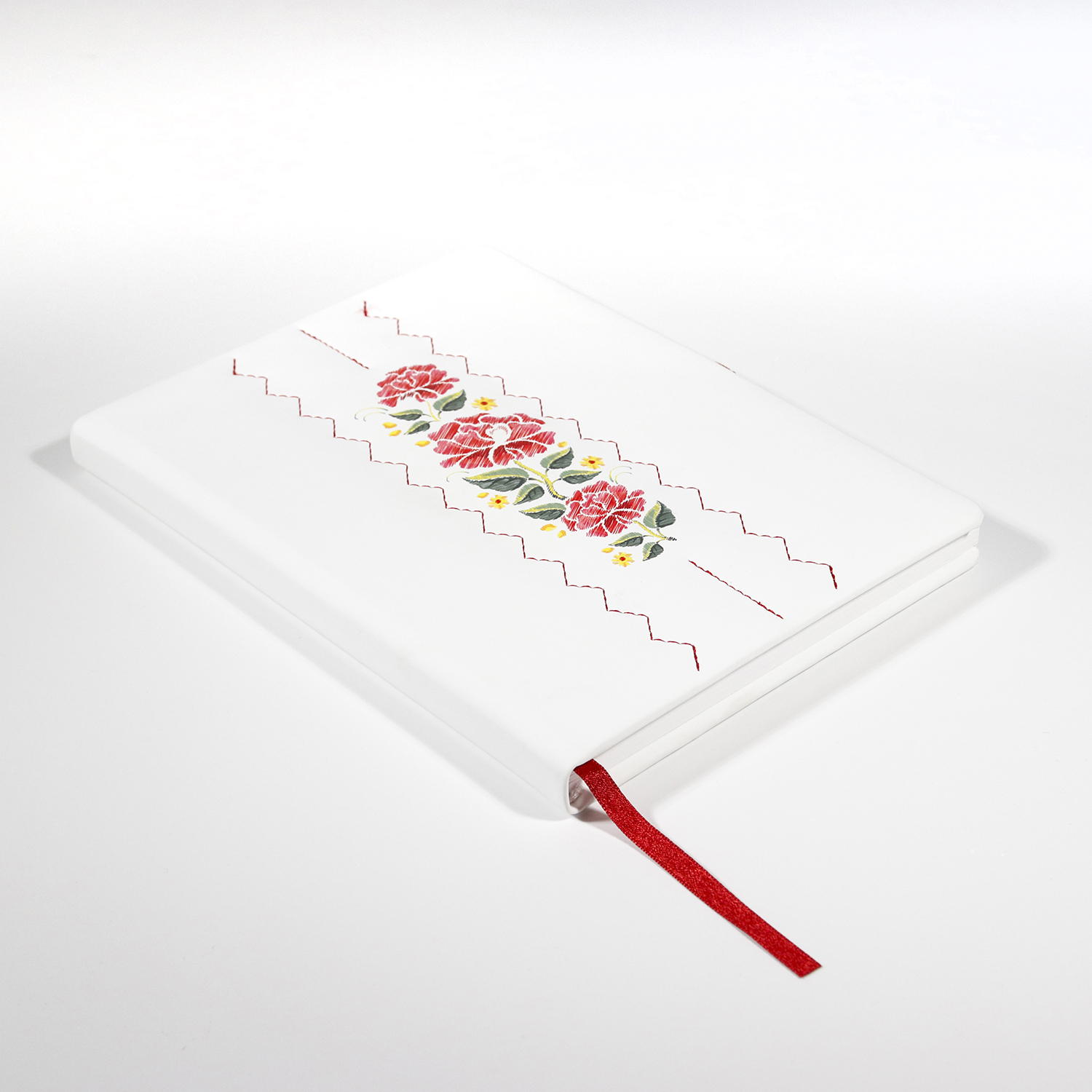 Copertă buretată, din piele ecologică de foarte bună calitate, textură Guma de culoare albă, personalizată prin UV print cu motiv ”Bujori”, cusături decorative de culoare roșie, creând astfel un design extrem de arăgător. |