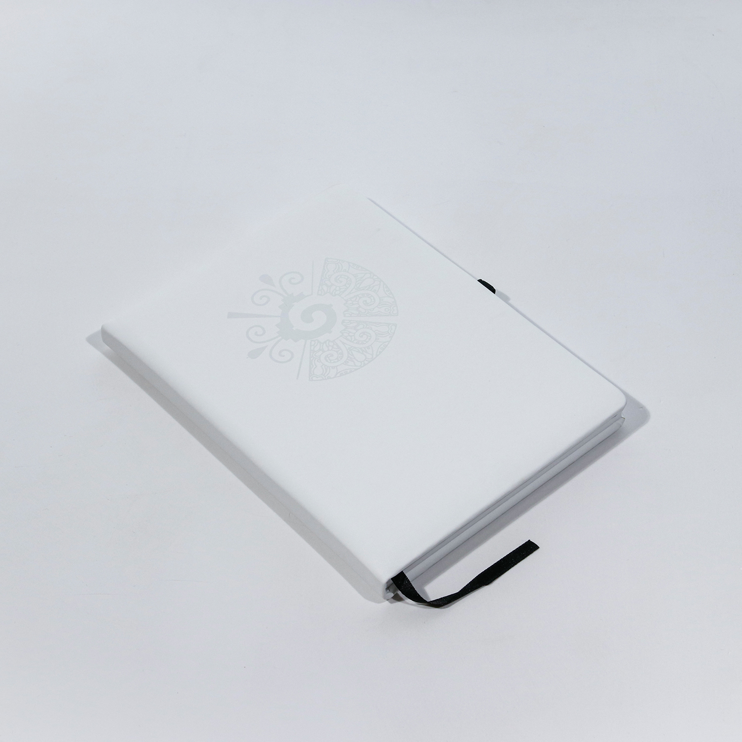Copertă buretată, din piele ecologică de foarte bună calitate, textură Guma de culoare albă, personalizată prin UV print și lăcuire, creând astfel un design extrem de arăgător. |