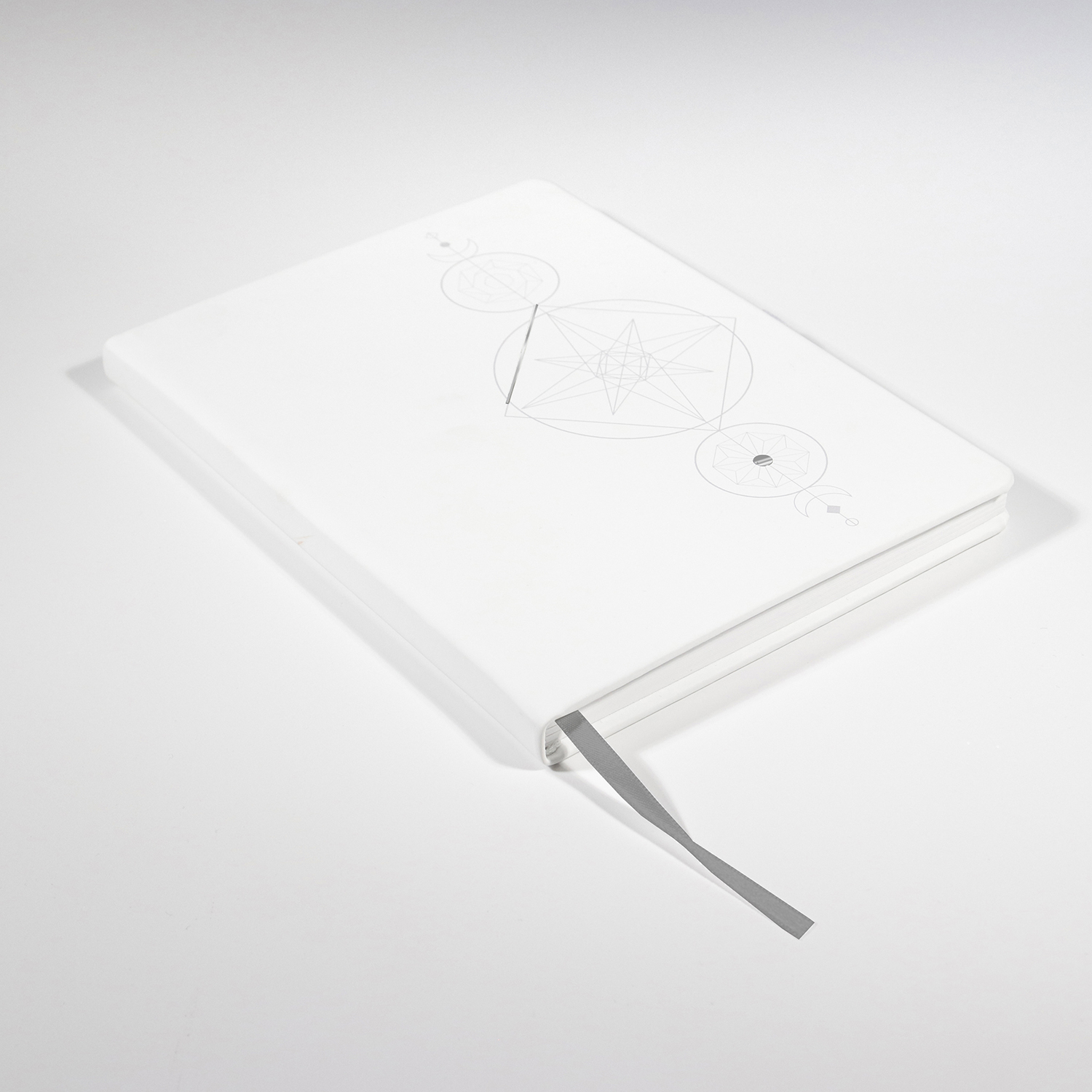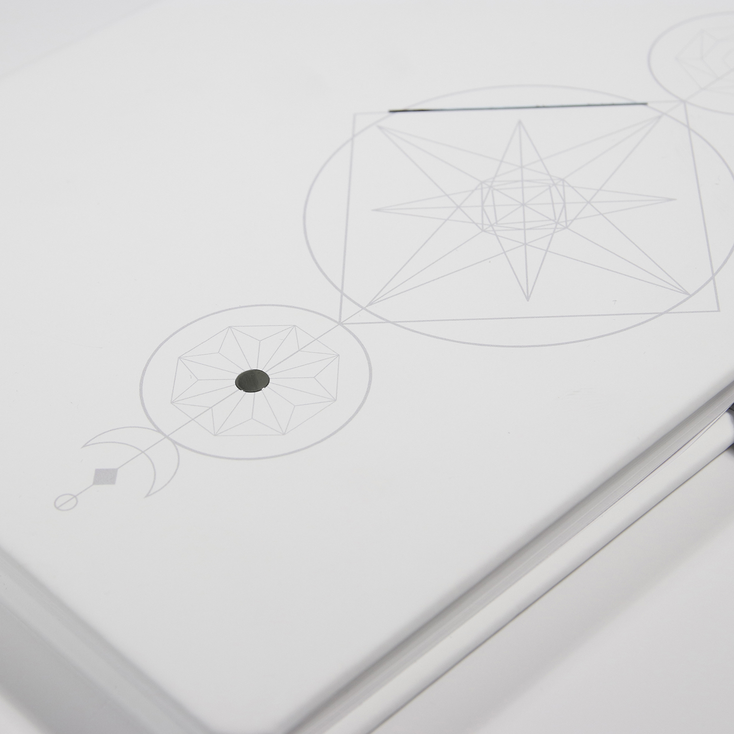 Copertă buretată, din piele ecologică de foarte bună calitate, textură Guma de culoare albă, personalizată prin UV print cu motive geometrice, două elemente metalice argintii, creând astfel un design extrem de arăgător. |