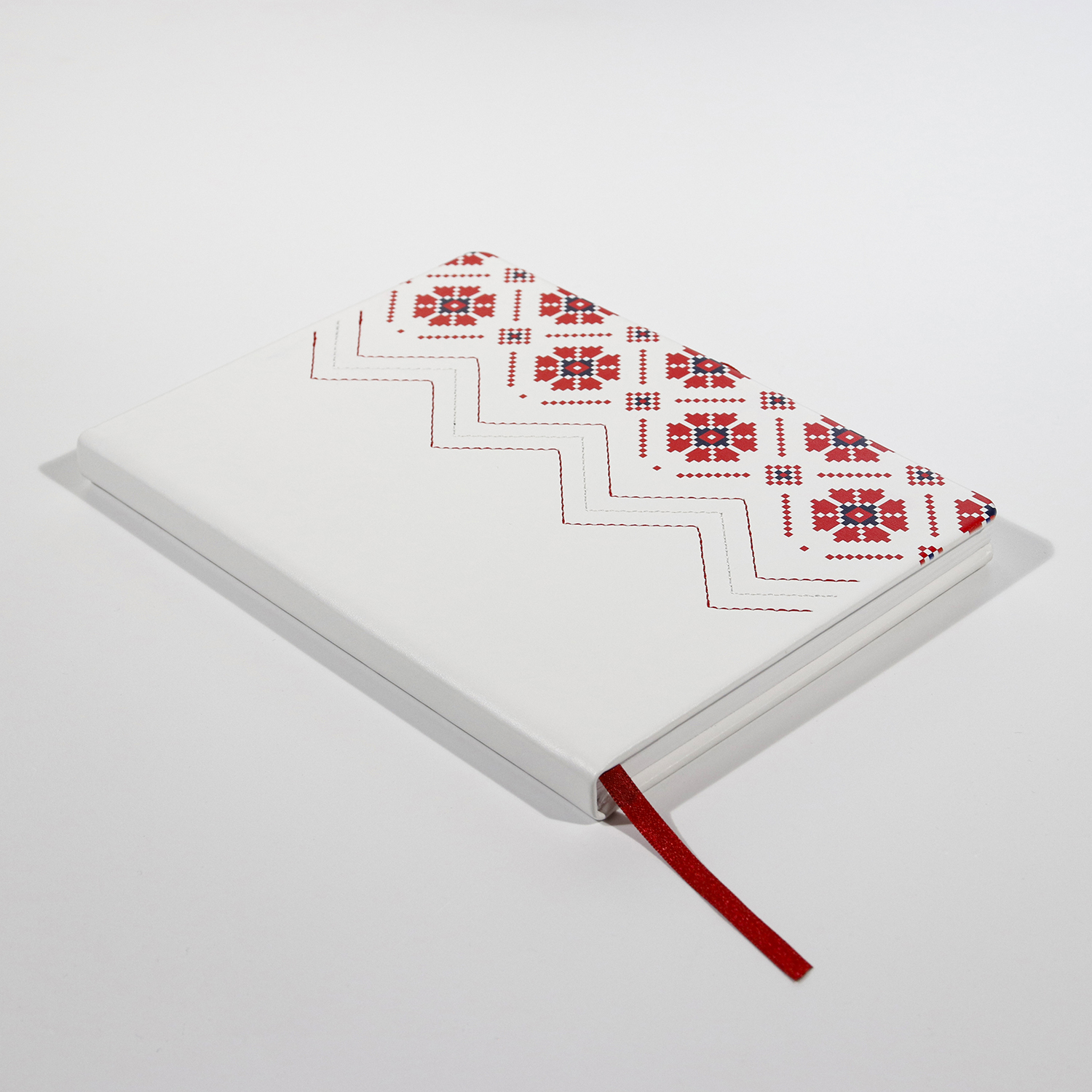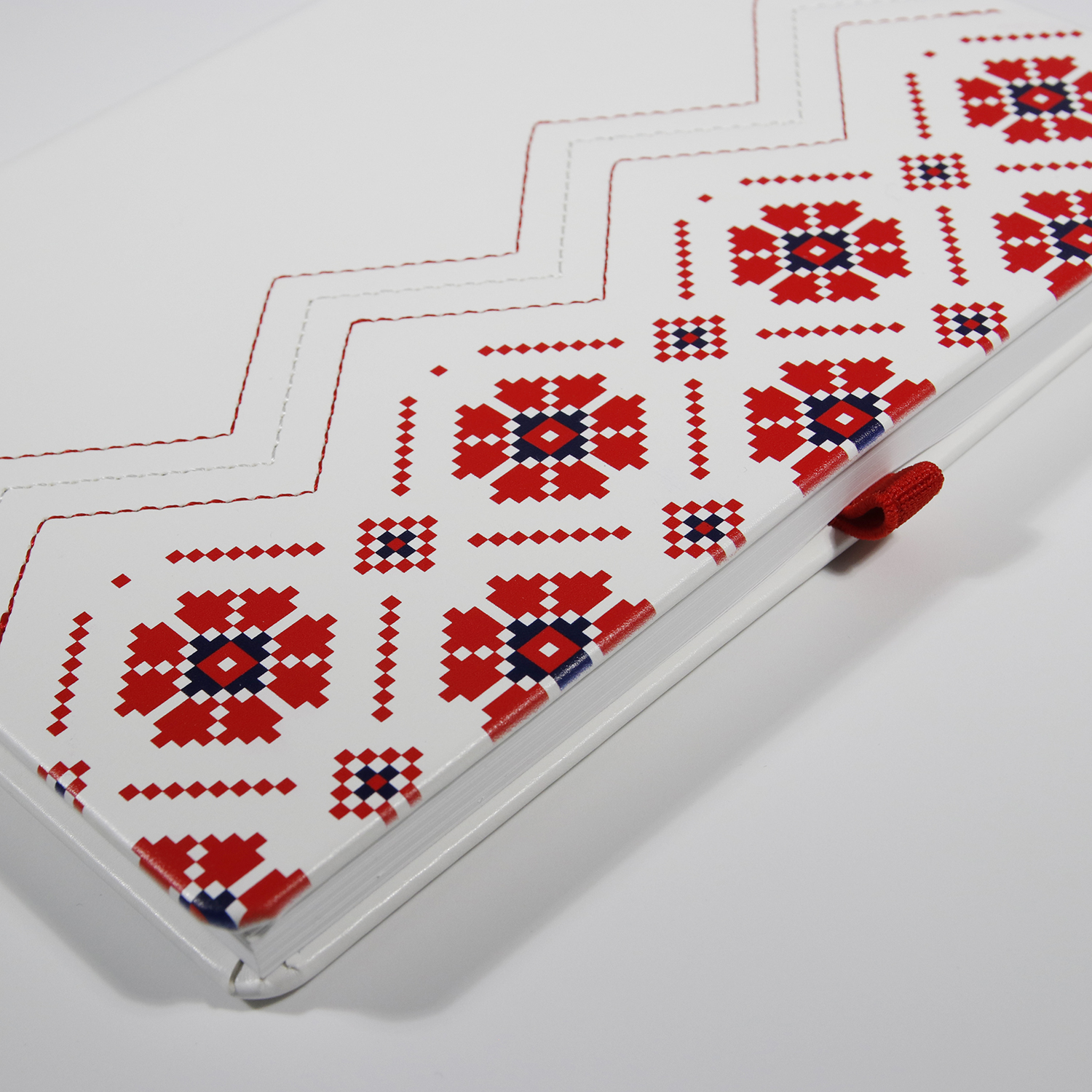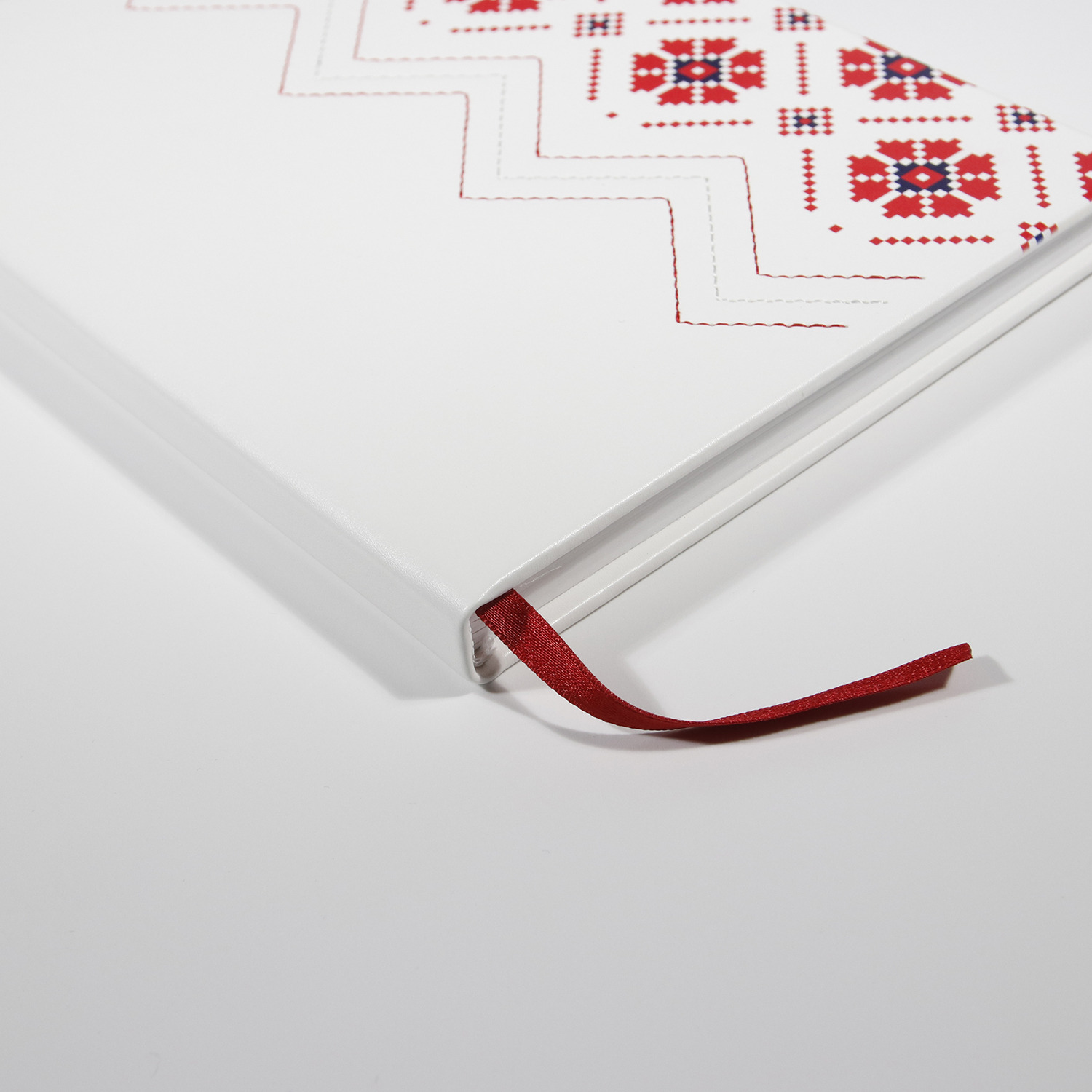 Copertă cartonată, din piele ecologică de foarte bună calitate, textură Ideo de culoare albă, cusături decorative de culoare albă și roșie , personalizată prin UV print cu motive tradiționale, creând astfel un design extrem de arăgător. |