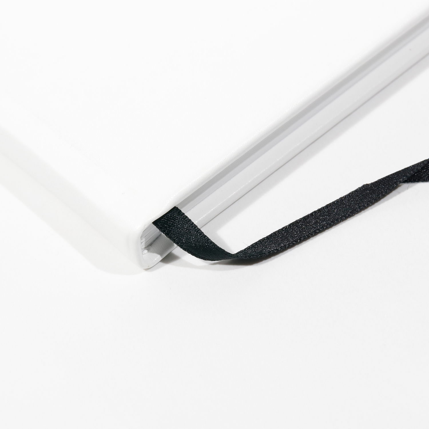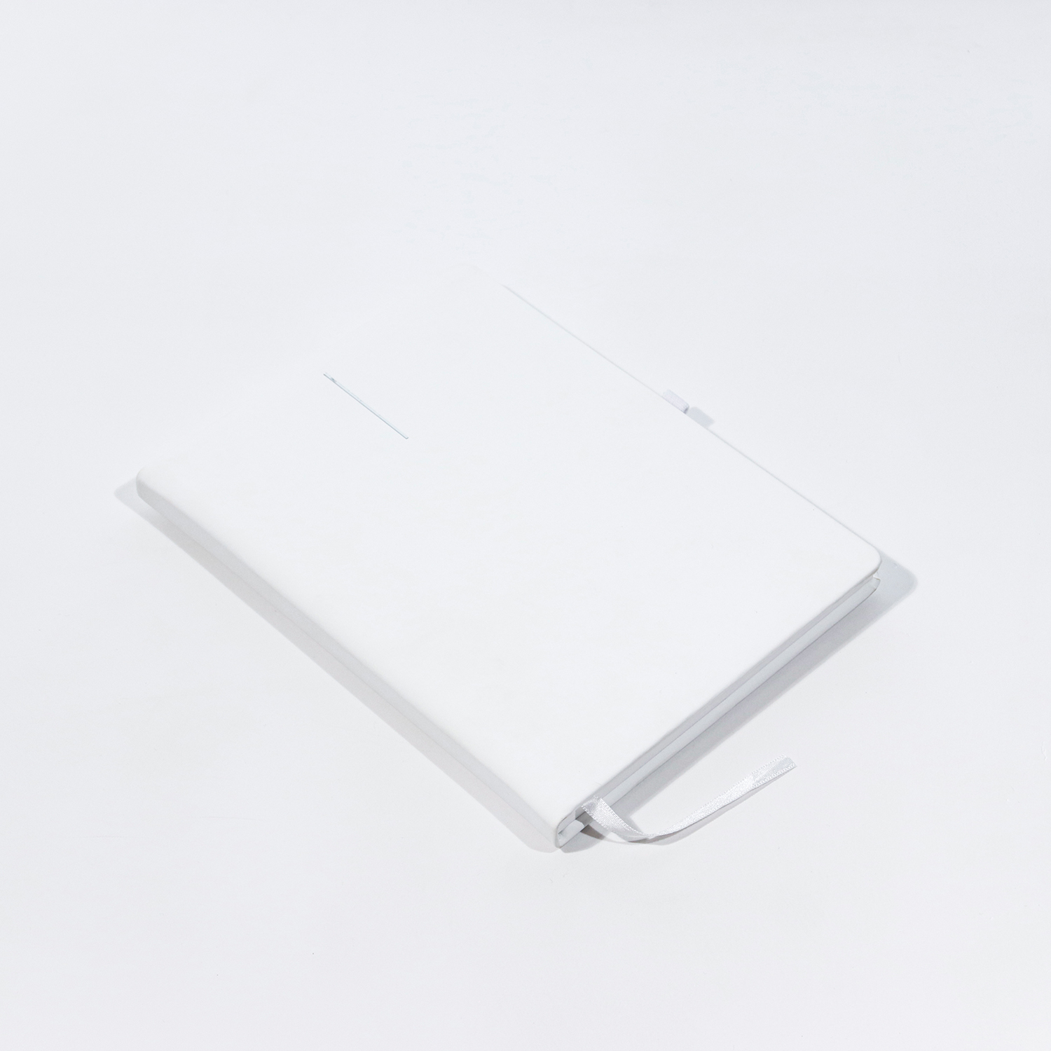 Copertă cartonată, din piele ecologică de foarte bună calitate, textură Ideo de culoare albă personalizată printr-un element metalic argintiu M20 B, creând astfel un design extrem de arăgător. |
