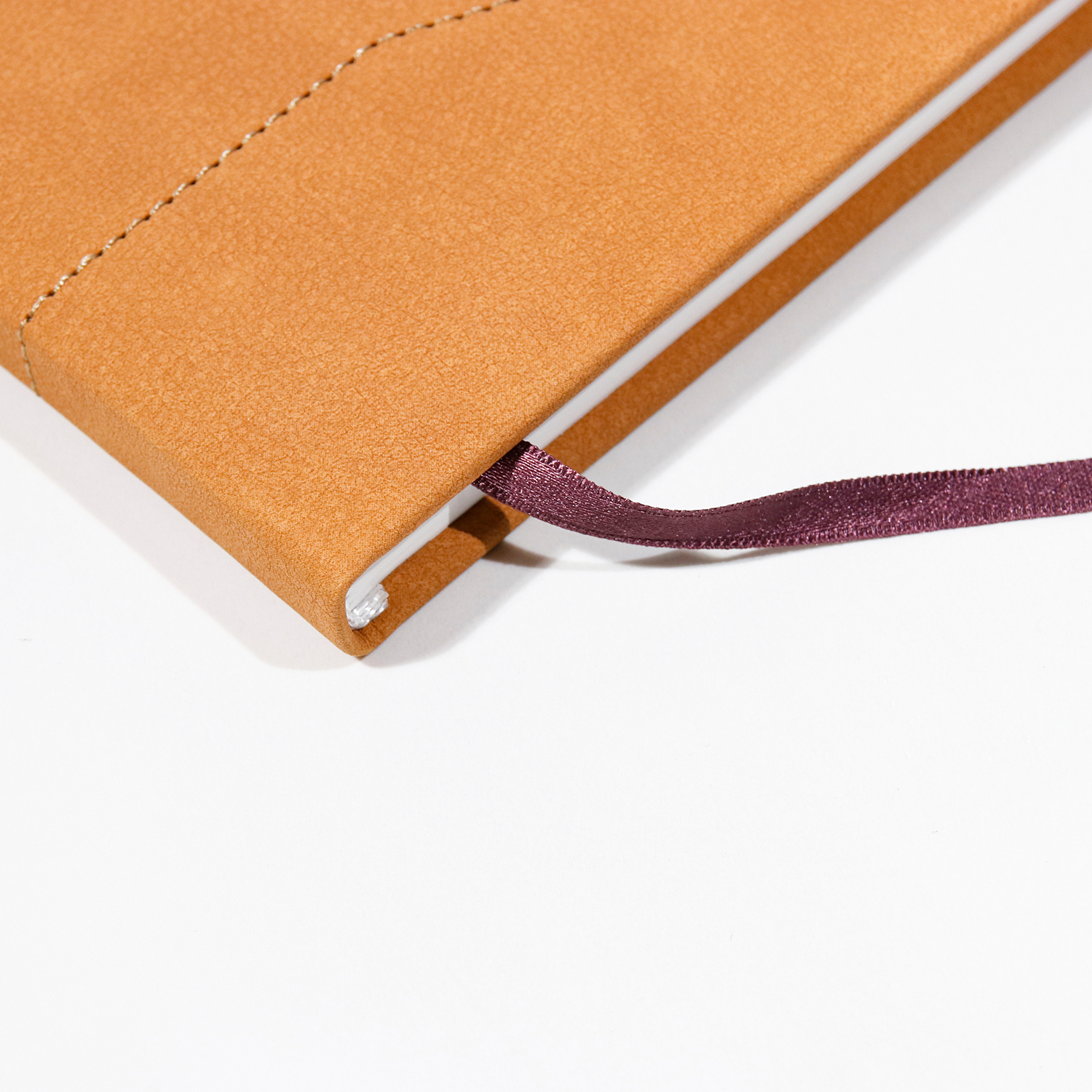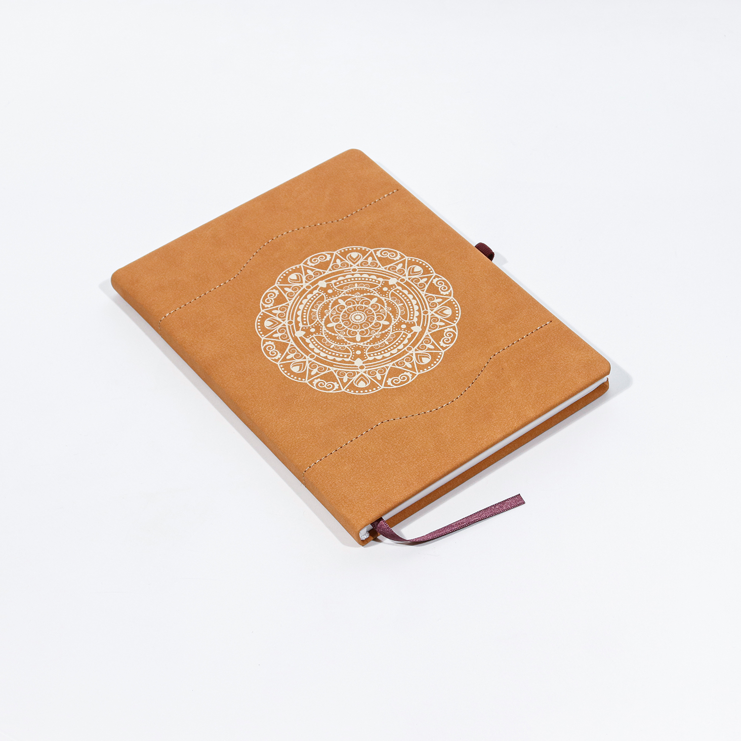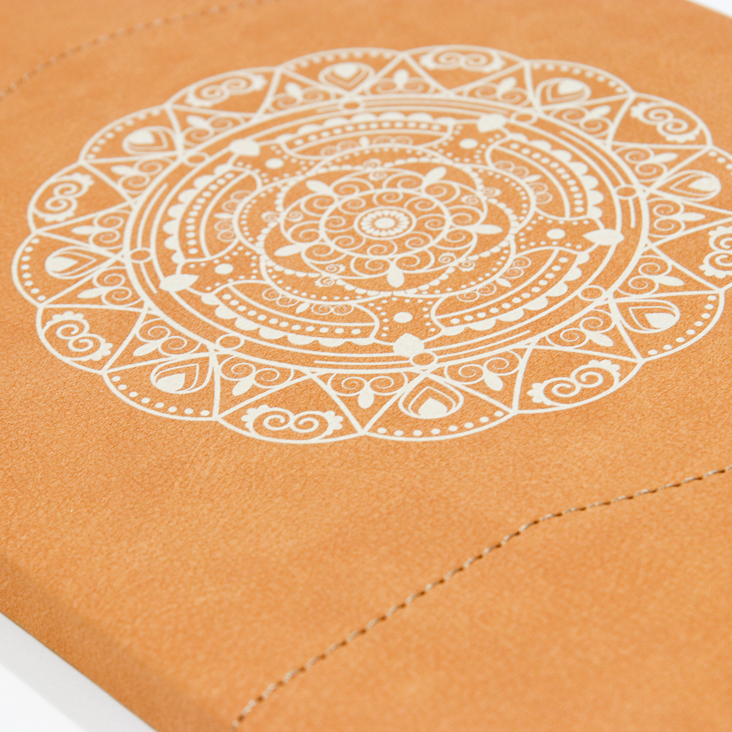 Copertă cartonată, din piele ecologică de foarte bună calitate, textură Senso de culoare maro deschis , personalizată prin UV print și cusături decorative de culoare beige creând astfel un design extrem de atrăgător. |