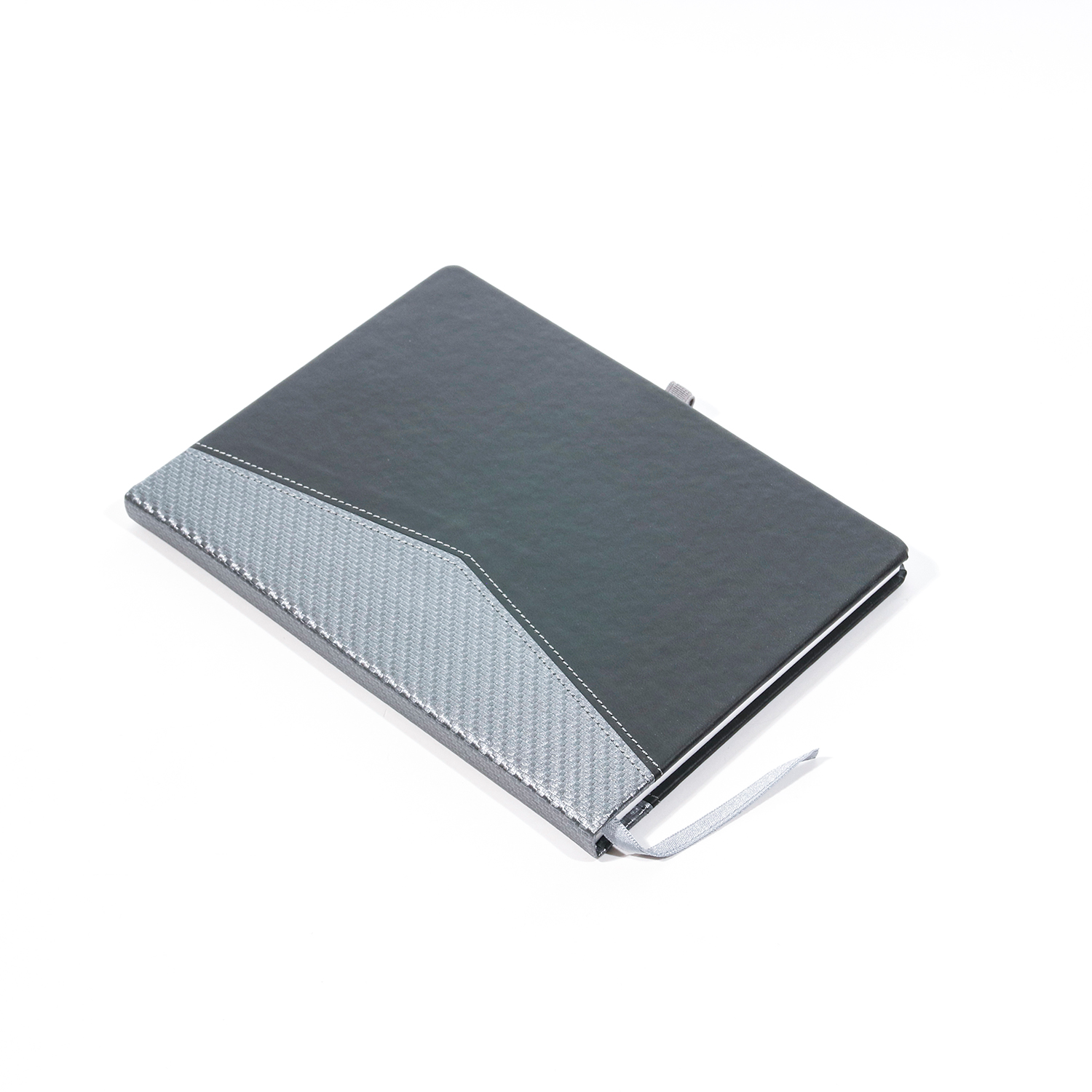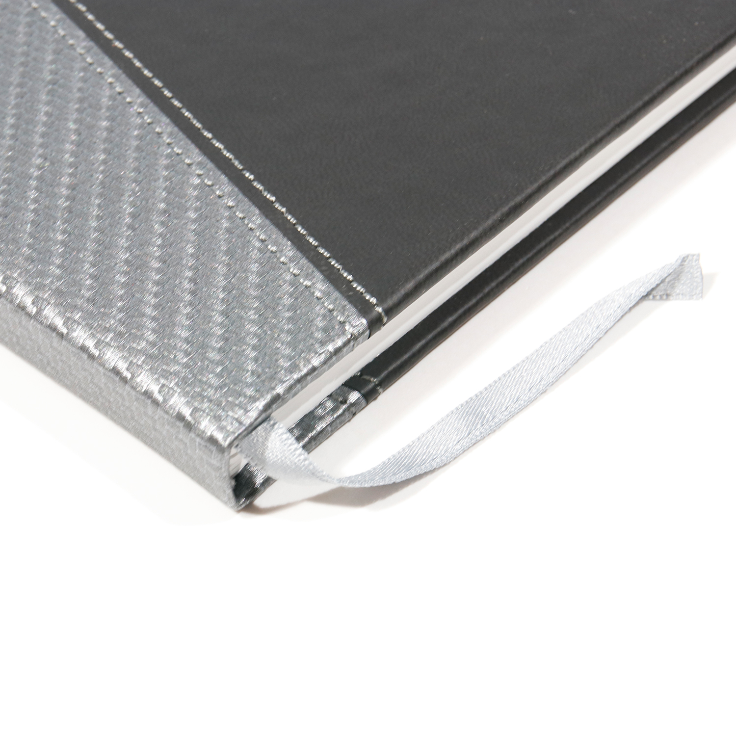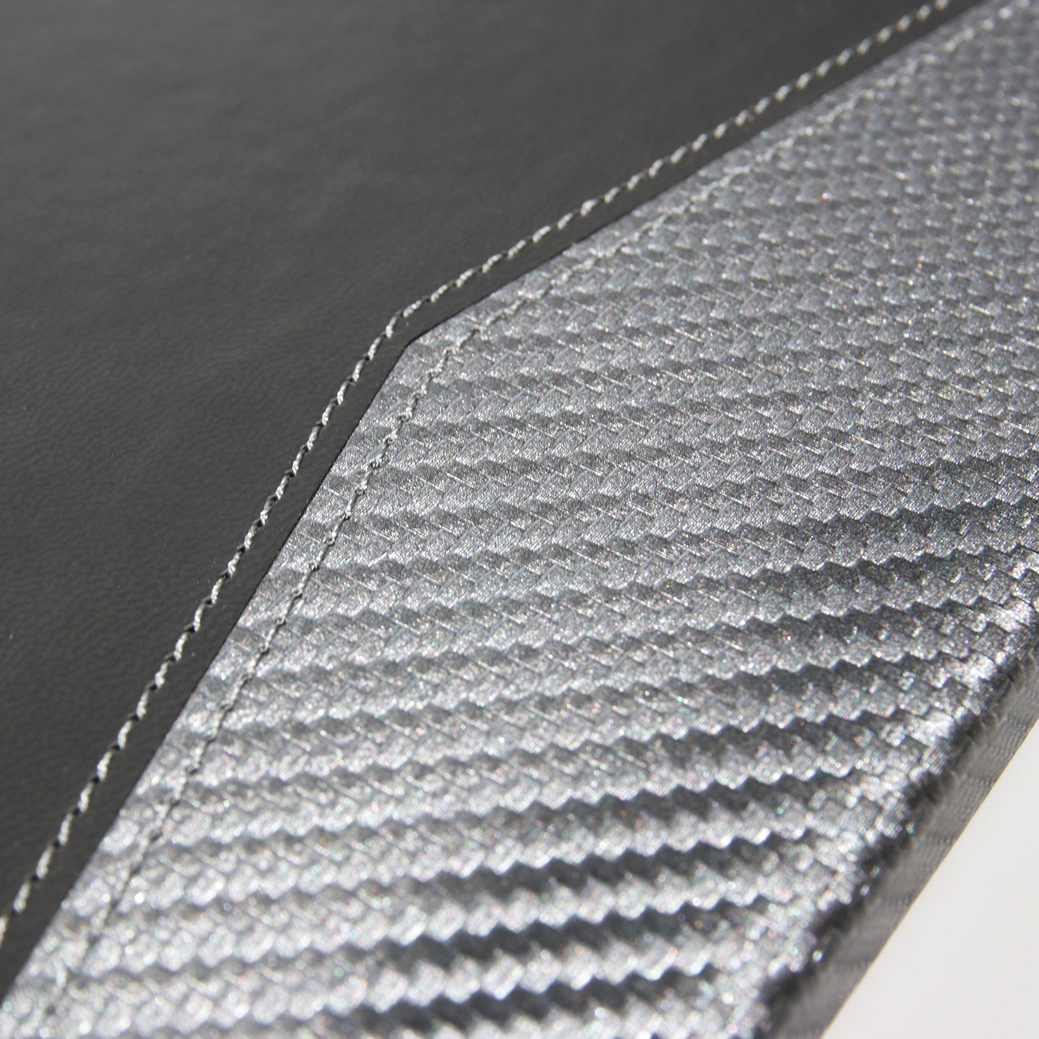 Copertă cartonată, din piele ecologică de foarte bună calitate, textură Vivela de culoare neagră combinată cu textură Carbon de culoare gri,personalizată prin cusături decorative de culoare gri, creând astfel un design extrem de atrăgător. |