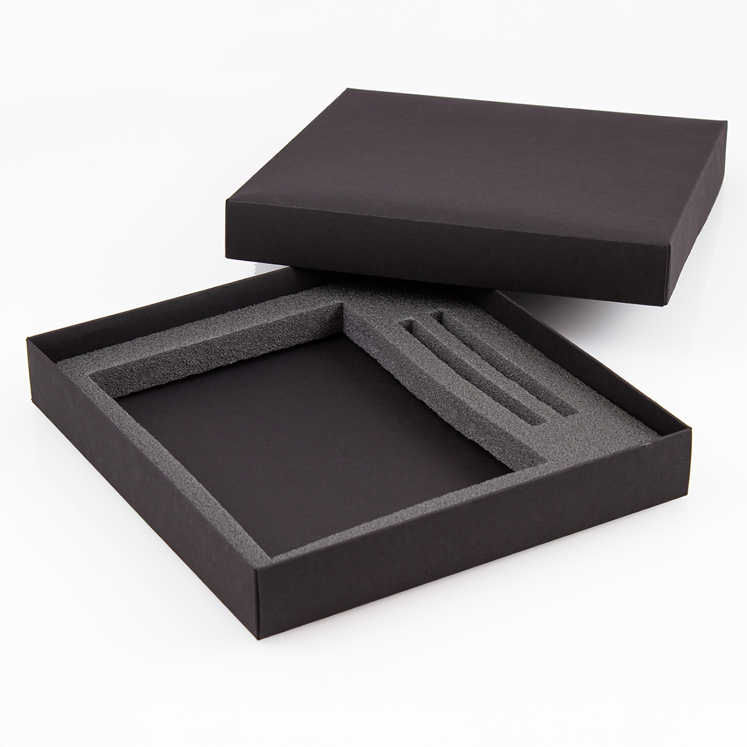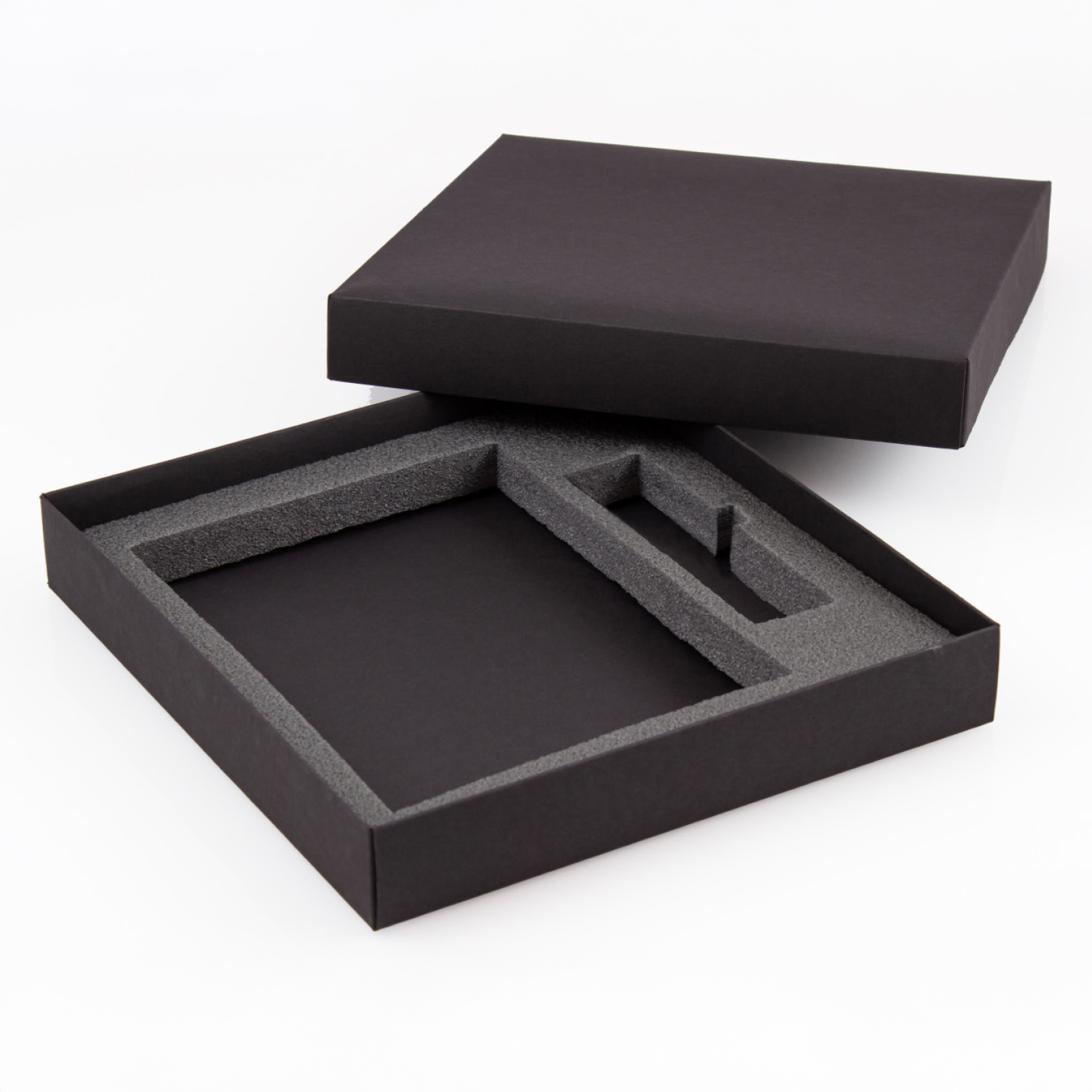 Cutie elegantă, din carton negru, colorat în masă, gramaj 400gr/mp, ce conține în interior un suport din spumă poliuretanică debitată pe conturul agendei și instrumentului de scris sau al obiectului ales , dimensiuni: 25x26.5x4cm